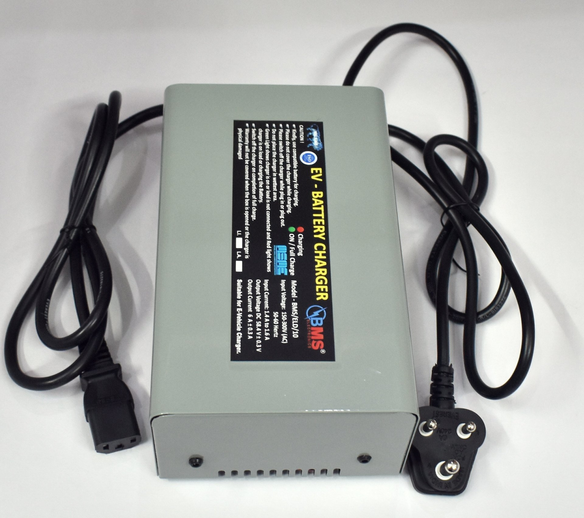 This is BMS brand electric vehicle charger for lithium ion battery as well as for lead acid battery in 48 volt. it is compatible in both lead as well as in lithium, it is a heavy duty charger,,it can charge both type of battaery also either LFP or NMC, but before using is kindly see the caution and read it carefully, it is automated battery charger made in india by BMS Electronics. this is 48 volt cut off 58.4, 54.6, 59 in 5 amp.
